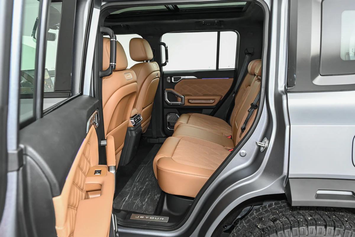2026款捷途旅行者延续了经典的方盒子造型设计,整体轮廓方正硬朗,呈现出鲜明的硬派越野风格。前脸采用立体宽阔的JETOUR光影格栅,内部镶嵌六段式英文字母标识,装饰灯组经过暗化处理,在不点亮时保持简洁,点亮后则呈现出层次丰富的光影效果。车侧线条平直硬朗,配备全新设计的R19轮毂,更宽的上下车踏板宽度增加至140毫米,既提升了实用性,也强化了越野姿态。车尾保留外挂备胎设计,后保险杠加入高亮黑装饰元素,与车头形成呼应。新车新增深海蓝车漆颜色,在阳光下呈现出金属光泽质感。接近角28度、离去角30度、最小离地间隙220毫米,这些参数保证了良好的通过性。