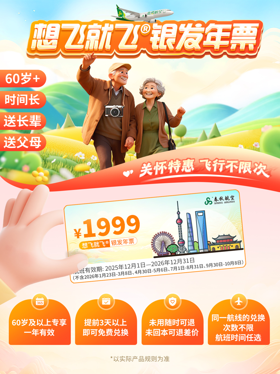 春秋航空首次推出面向60周岁及以上老年用户的“银发年票”,售价1999元。该产品可无限次兑换春秋航空9C执飞的国内(含港澳台)及国际航班机票(包机航线除外)。使用航班日期为2025年12月1日—2026年12月31日。其中,2026年1月23日—3月8日、2026年4月30日—5月6日、2026年7月1日—8月31日、2026年9月30日—10月8日为不可用日期。“银发年票”同样享有提前3天免费兑票、未使用随时退款,未回本退差价等安心保障。
