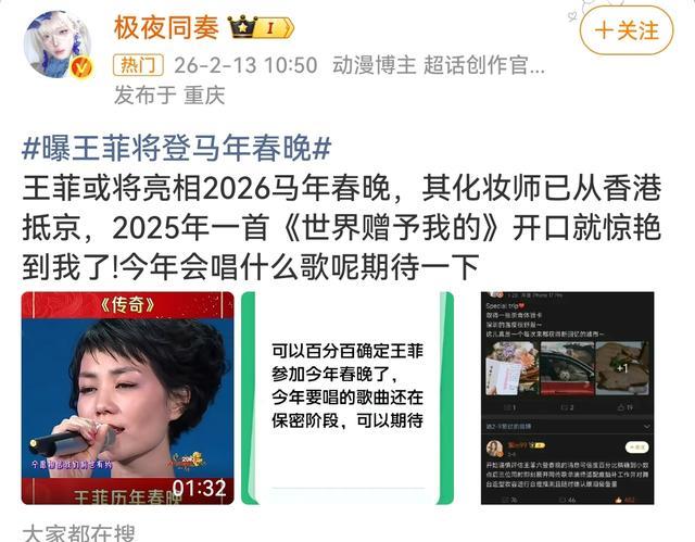 我相信很多人都期待她,那就是王菲!今天有大博主爆料,王菲或将亮相2026马年春晚,而且她的御用化妆师已从香港抵北京。通过这位博主爆料,这事应该是十有八九,可信度极高。