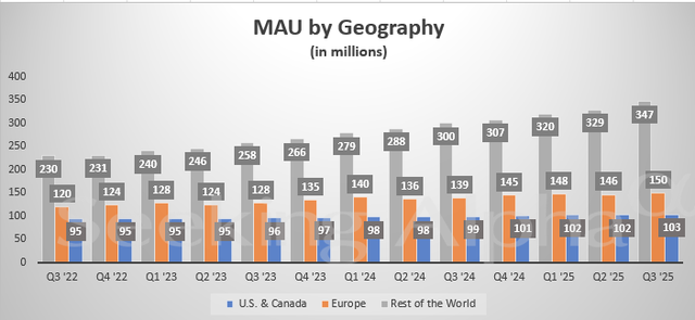 然而,公司首席财务官Julia Donnelly在财报电话会议中提到,第三季度美国和加拿大地区出现了部分“广告支出放缓的情况”。她指出,销售额增长放缓与一些“美国大型零售商”有关,这些零售商正面临关税相关问题,利润率承压。第三季度,其利润最丰厚的北美市场,月活用户规模环比仅增长100万至1.03亿,销售额为7.86亿美元,低于市场预期的7.99亿美元。