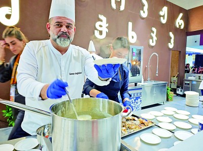 第八届中国国际进口博览会格鲁吉亚展厅,展商与游客分享当地美食。本报记者 范天培摄/光明图片